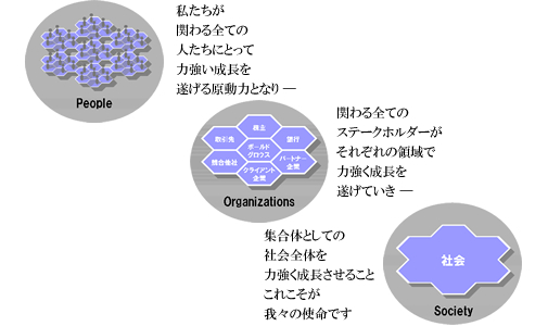 社会の最小構成単位は「人」。その「人」ひとりひとりに、コンサルティング、システムインテグレーション、事業再生という様々な切り口からアプローチし、成果とカタチに結び付けていく。そういう人を沢山育て、社会の成長に寄与する。それが私たちの使命だと考えています。